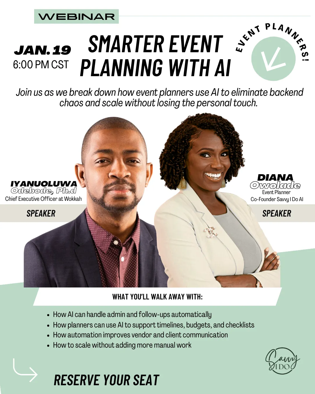 Diana Owolade is an experienced event planner and the Co-Founder of Savvy I Do, an AI-powered platform built to help event planners streamline operations, eliminate backend chaos, and scale sustainably.